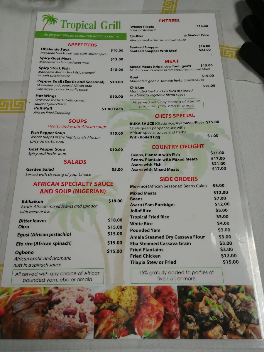 Welcome to Tropical Grill, your premier destination for authentic West African cuisine in Jamaica, NY. Nestled on Rockaway Blvd, this vibrant eatery invites you to indulge in an array of traditional dishes that transport your palate straight to West Africa. Dive into the hearty Fish Pepper Soup showcasing whole tilapia simmered in spicy herbs for just $17, or savor the rich flavors of the Goat Pepper Soup at $11.